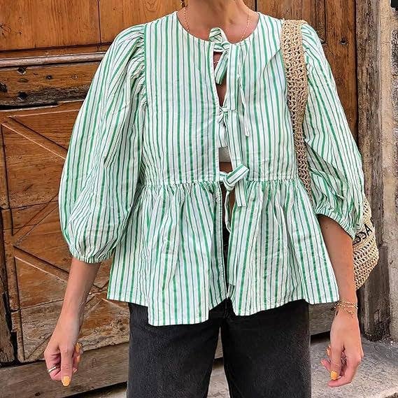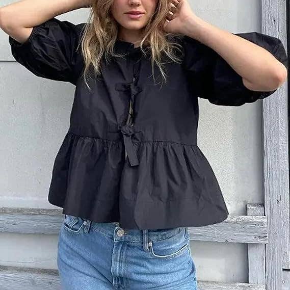 Caldorian bow tie front round neck Bubble blouse_RCJY01627